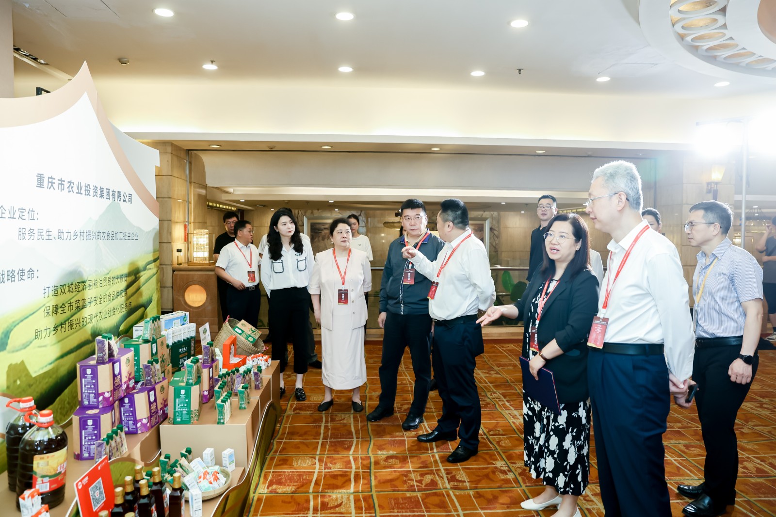 (圖為在市農(nóng)投集團(tuán)展區(qū),“天友”“百特”乳品、“味澤園”“紅蜻蜓”食用油、“人和”大米等本土明星產(chǎn)品集中亮相,吸引眾多企業(yè)代表駐足參觀洽談。)